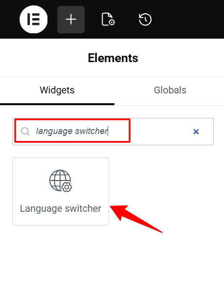 - From the Elementor widgets panel, search for “Language Switcher”.