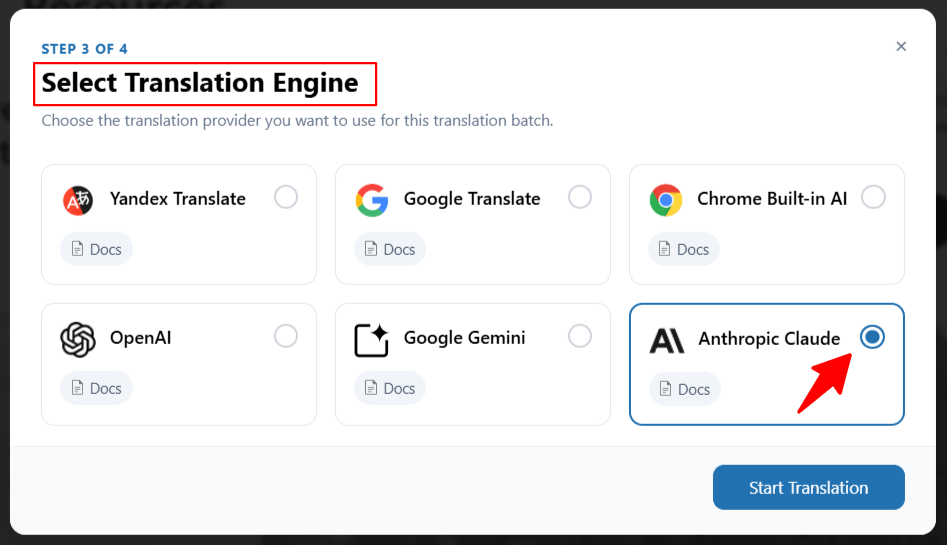 • A pop-up will appear asking you to choose a translation provider. Select Anthropic Claude from the available options.