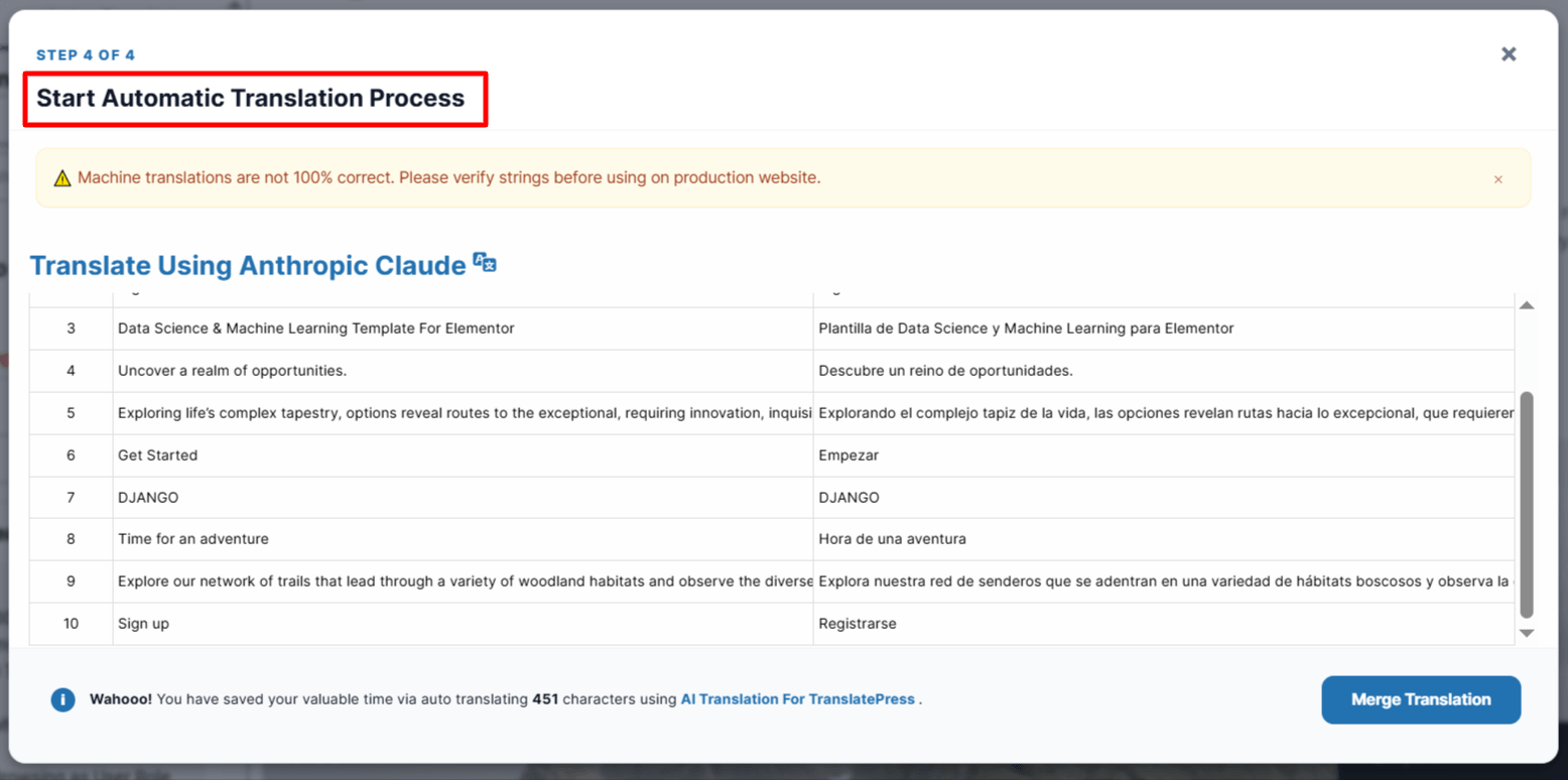 If you’re using AI Translation for TranslatePress, you can enable the Anthropic Claude to automatically translate your webpage content within a few minutes.