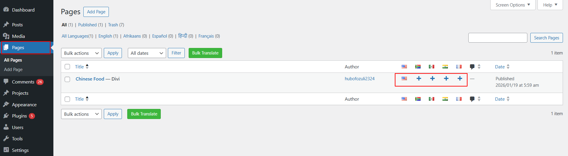 Polylang pluginand theAutoPoly - AI Translation For Polylangon your WordPress website. - Navigate to the pages section and select the target translation language from the list of available languages provided by Polylang.
