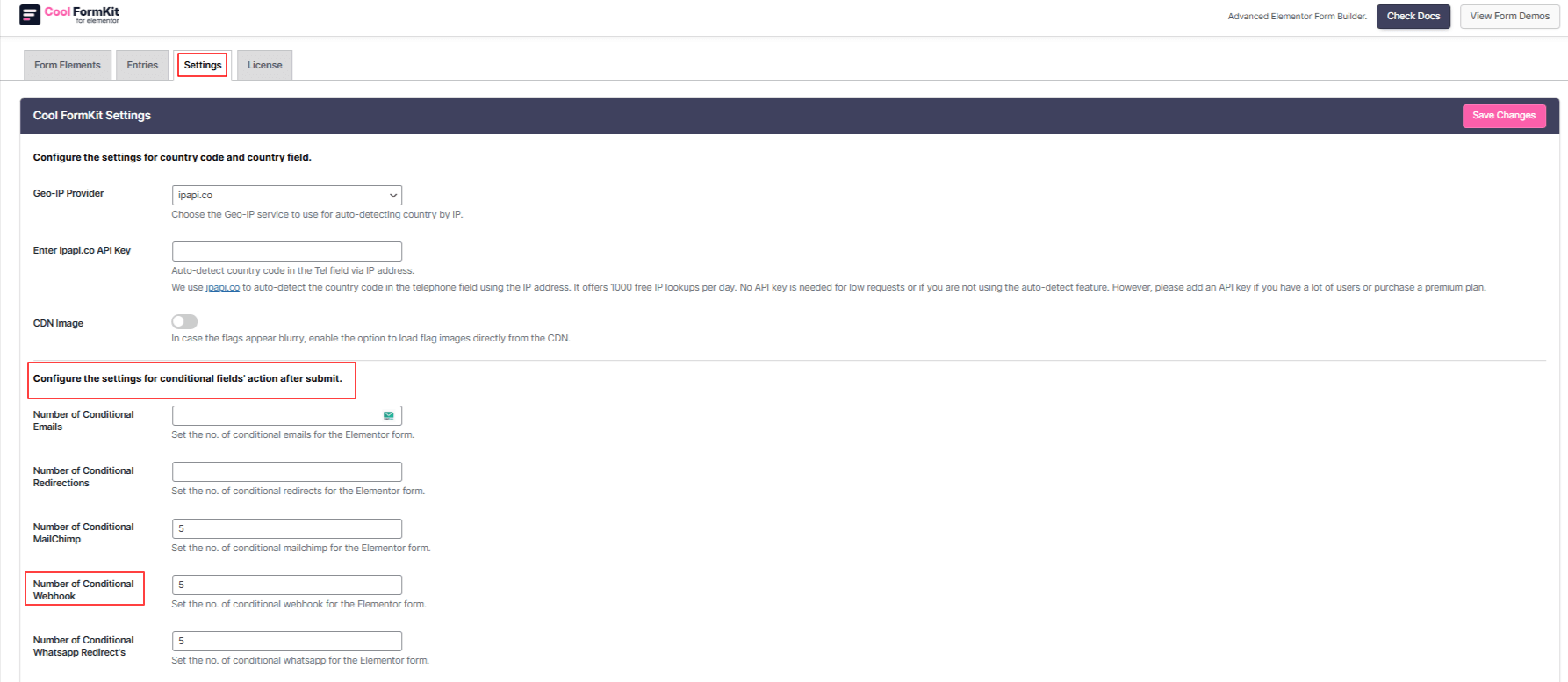 * Firstly, make sure you have turned on the Conditional Webhook feature in the WordPress Admin Panel >> Elementor >> Cool FormKit >> Form Elements Tab.