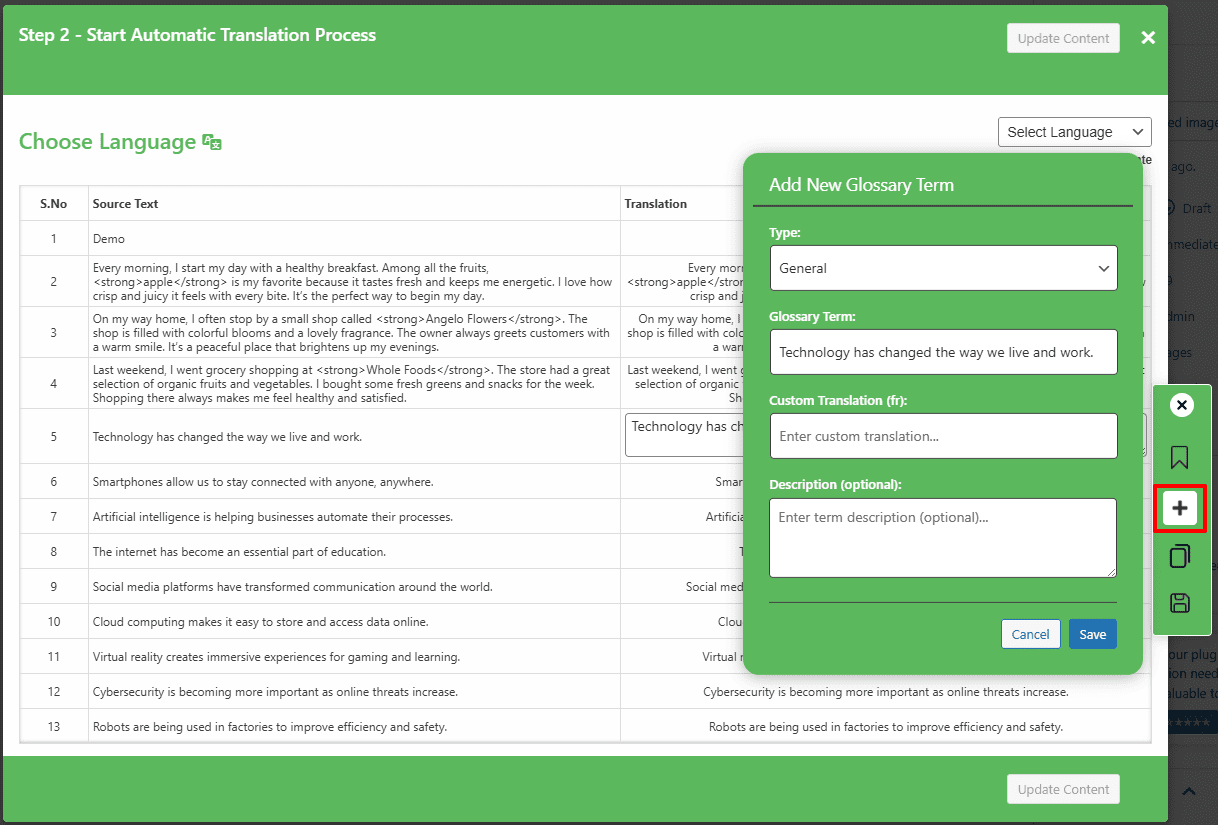 AutoPoly-AI Translation For Polylang allows you can easily create and manage glossary terms to keep your translations consistent across your entire website.