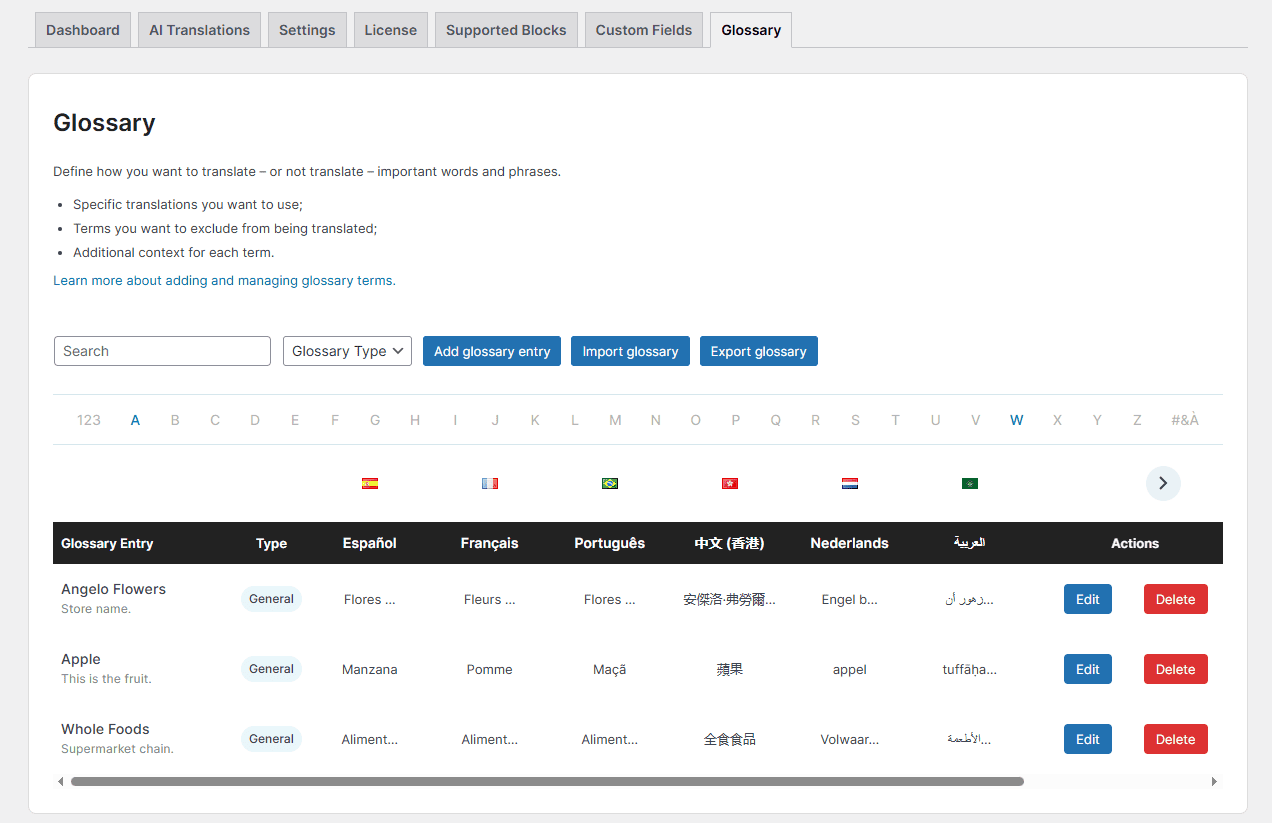 The Glossary feature is a powerful tool used in translation and localization platforms (such as Google Translate API, DeepL, or Polylang AI Translator) to ensure consistent and accurate translations of specific words or phrases across your entire website or project.