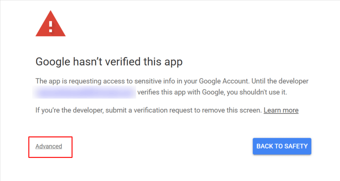 - Log in with your Google account. If a security warning appears, click Advanced, then choose Go to (unsafe) to proceed.