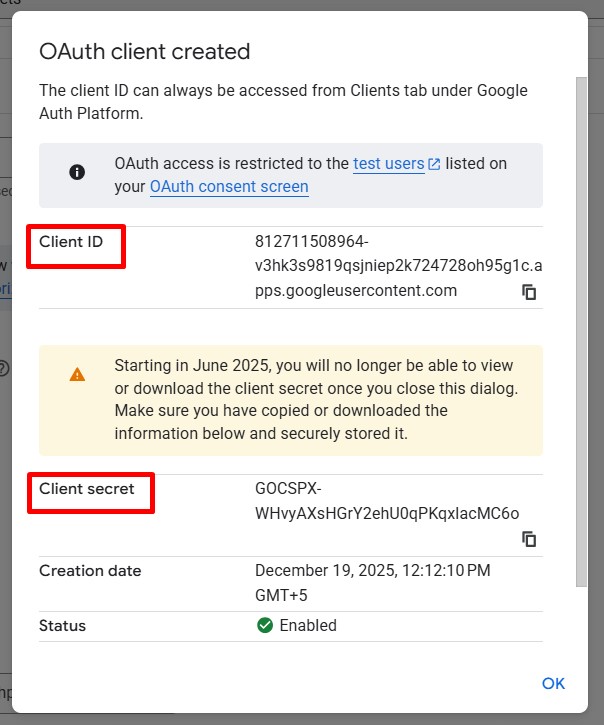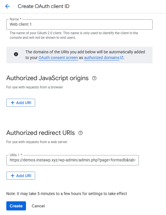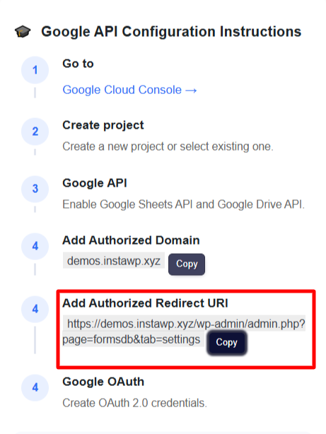 - Copy the redirect URI, and paste it into the Authorized Redirect URIs field in Google Cloud.