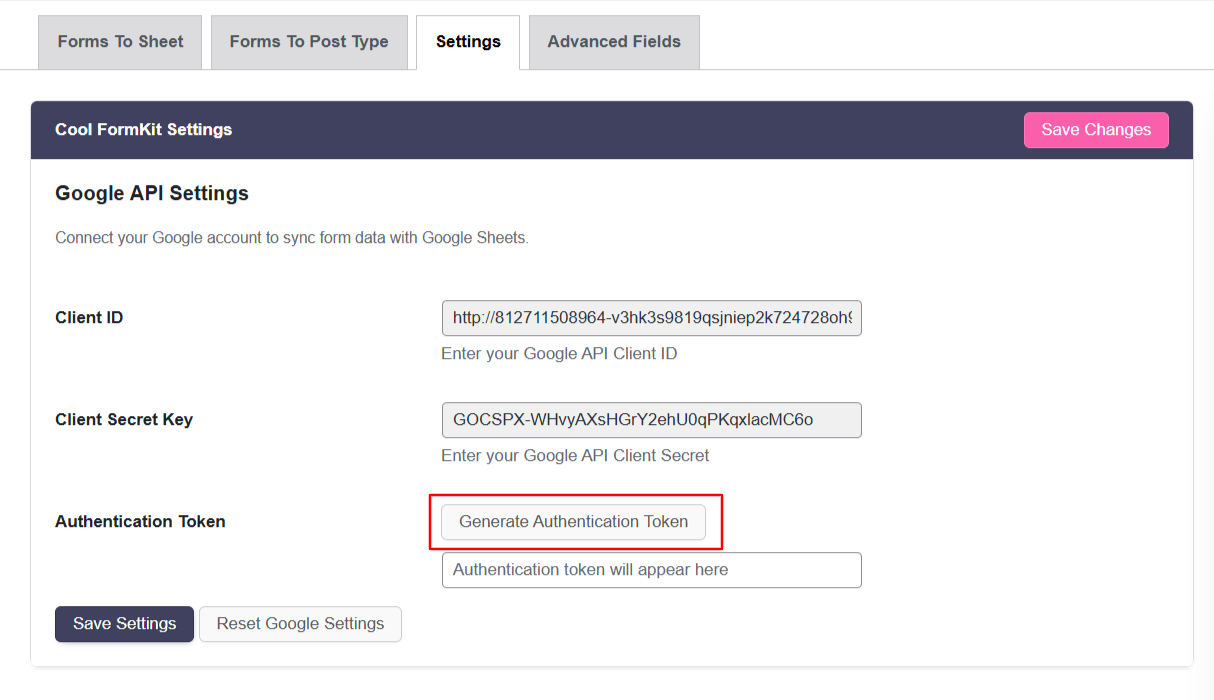 - The Google API authentication token will be generated, and your Google Sheets account will be successfully connected.