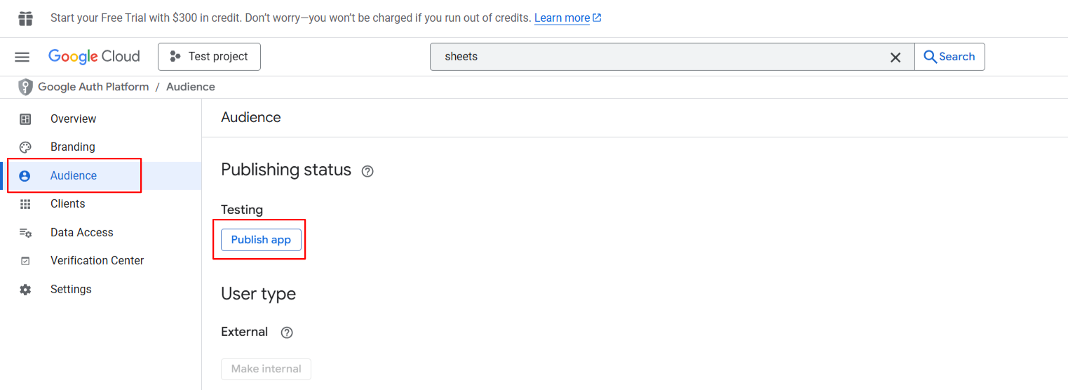 - Now, from the Google Cloud Console, go to the Audience section and click Publish App.