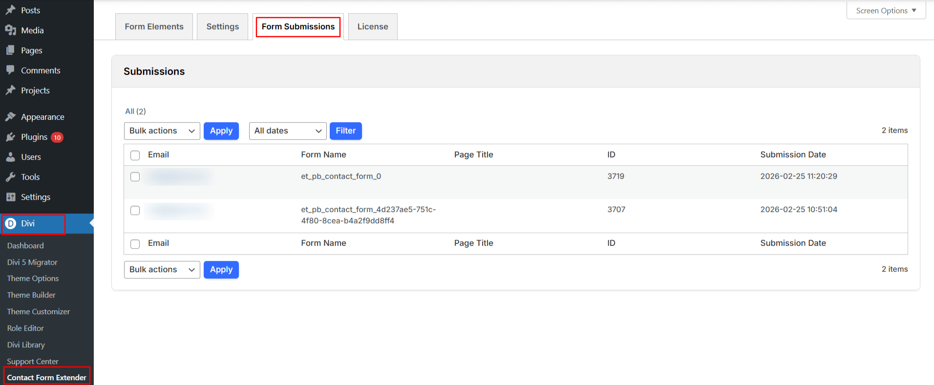 - Once enabled, all form entries will be stored securely within WordPress. You can view these entries by navigating to: Divi > Contact Form Extender > Form Submissions.
