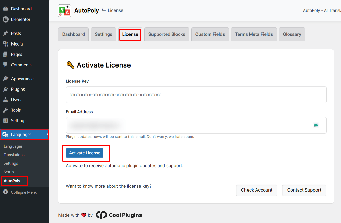 Para seguir recibiendo actualizaciones automáticas y acceso a soporte, necesitarás gestionar adecuadamente tu licencia de AutoPoly – AI Translation for Polylang. En esta guía, aprenderás cómo gestionar tu clave de licencia.