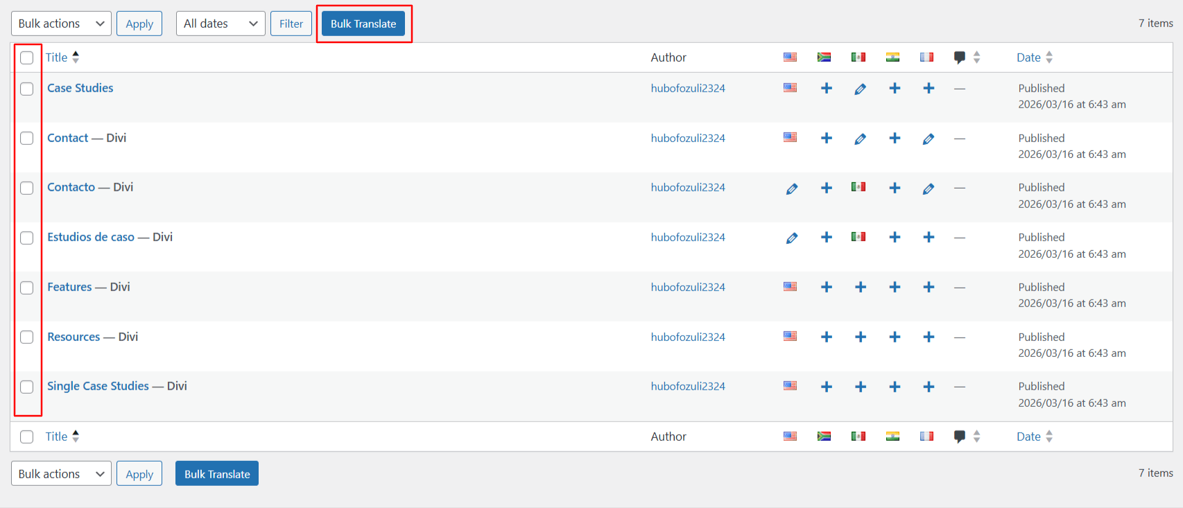 - Ve al Escritorio de WordPress > Páginas. Usa las casillas de verificación para seleccionar una o más páginas que deseas traducir